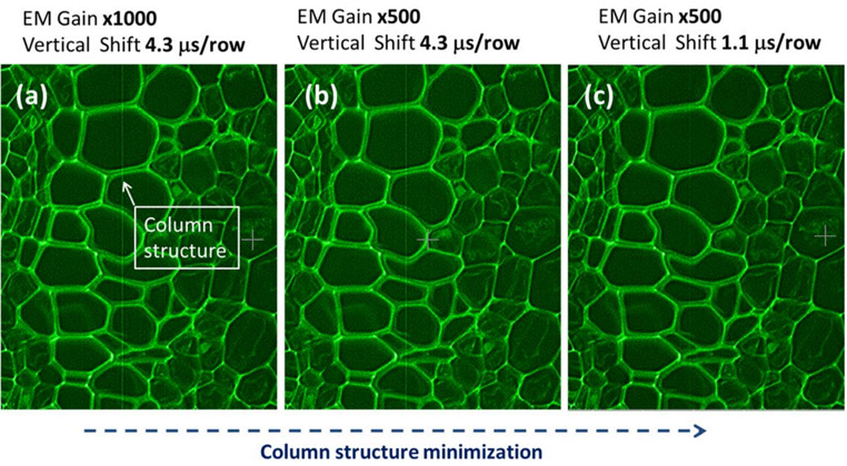 Recommended acquisition settings to further optimize iXon 888 SRRF-Stream image quality:It has been observed that the possible SRRF-Stream column effect on iXon Ultra and iXon Life 888 models may be further significantly reduced by following these acquisition parameter guidelines: - Do not use EM Gain greater than x500. This is sufficient multiplication gain to ensure read noise is negligible. Higher EM gain values can bring out the column effect in very low light images.