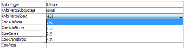 Figure 1 – Section of Micromanager Device Property Browser showing Vertical Clock Speed selection and Vertical Clock Voltage selection.